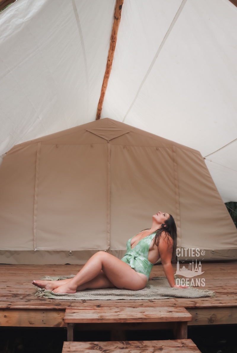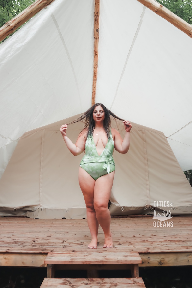 The Santa Cruz Swimsuit — California summer in tied-dyed green. Offering a full-coverage bottom, flexible, stretch fabric, UV-protecting material. Currently in stock in S (0-4), M (6-8), L (10-12), XL (14-16).